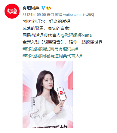 在2021年3月24日,网易有道词典宣布欧阳娜娜为2021年度全新品牌代言人,并邀请其成为有道词典“明星语音”功能女声明星。