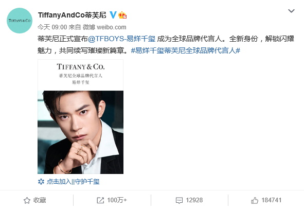 蒂芙尼正式宣布易烊千玺为“全球品牌代言人”,以全新身份继续演绎独一无二的摩登风尚与个性主张。