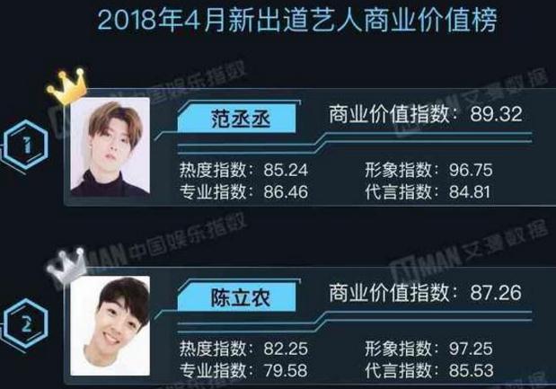 今日,中国文娱金数据四月份新出道艺人商业价值总榜TOP50正式发布,范丞丞,陈立农以及王子异分别排名榜单第一位,第二位以及第三位;朱正廷,尤长靖,小鬼,黄明昊以及林彥俊同样排名榜单前十位,偶像练习生全面霸榜,综艺节目《创造101》吴宣仪排名榜单第十四位,可谓来势汹汹!