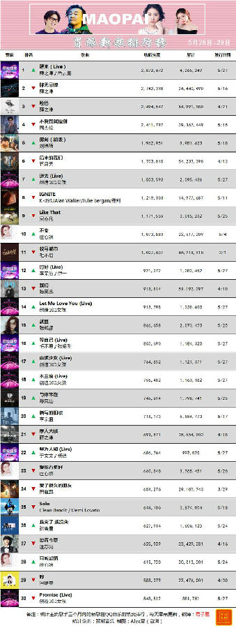 下面,明星经纪公司附上5月28日-29日榜单TOP30: