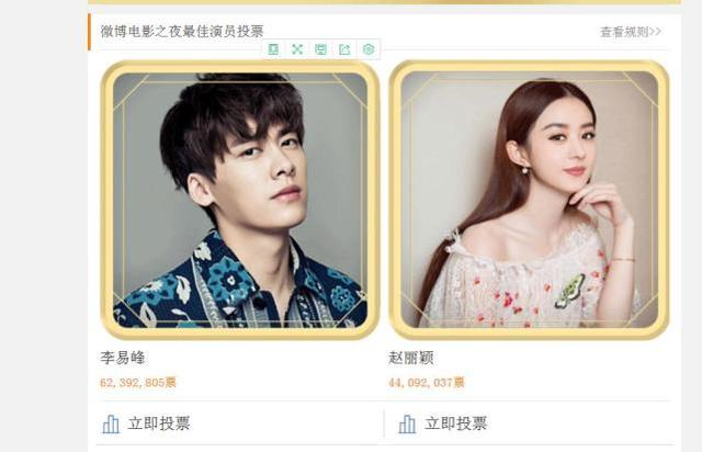 微博电影之夜的投票活动已经开启很长时间了,目前投票活动还有不到10天时间就要结束了,话说这次的微博电影之夜竞争还是很激烈的,特别是在最佳男女演员方面,从现在的投票趋势看,李易峰很大程度上会荣获最佳男演员的称号,而赵丽颖很有可能稳拿最佳女演员,毕竟赵丽颖的票数和第二名女演员周冬雨相差100万左右。