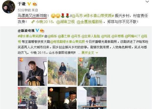 据明星经纪公司了解,和马苏合作过的李晨,杜淳也转发了微博,匡助宣传新剧。接档的是扶贫题材剧《绿水青山带笑颜》。