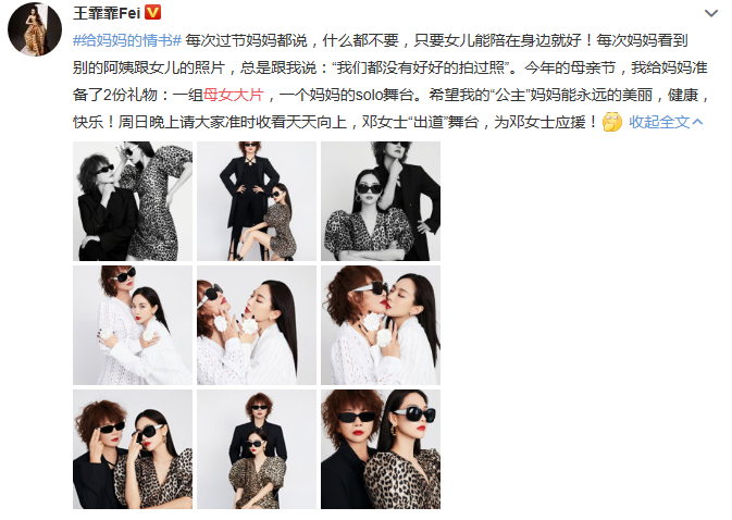 明星经纪公司知道“浪姐”王菲菲和母亲“女王涵”邓女士拍摄了一组合照,照片中两母女紧紧相依,母女情深,霸气中不失温柔。