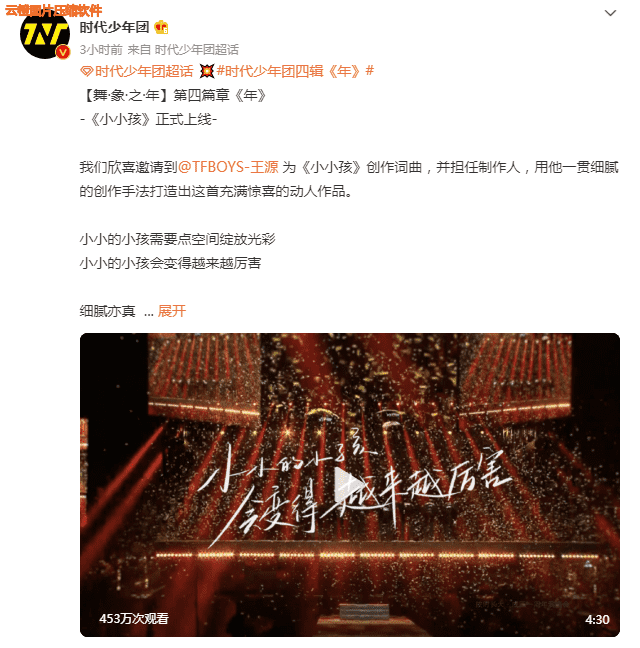 6月22日时代少年团《小小孩》正式上线,词曲都是有师哥王源创作,简直是梦幻联动啊,我们的原创音乐人王源,一直在努力向前跑,小孩也是可以为别人写歌的前辈了,从创作人到歌词到旋律到演唱者到MV都有够好哭的,小孩和小小孩一起长大啦!是独一份的家族感啊