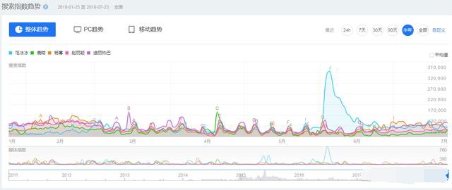 上图是2018年上半年百度网站的明星搜索数据,包括范冰冰、鹿晗、杨幂、赵丽颖、迪丽热巴的搜索情况;在今年6月前也就是范冰冰被崔永元曝出偷漏税的丑闻之前,范冰冰的百度搜索量很平淡,在负面新闻被曝光后,才迎来了搜索高峰。