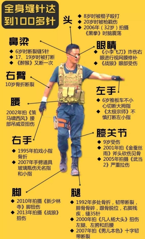 据说,吴京拍戏是从来都不用替身的,无论是多危险的戏份他都是亲自上阵,对于演员来说,拍摄现场一般都是非常辛苦的,尤其是武打戏,受伤都是常有的情况,据吴京的粉丝统计,截止至今,吴京全身上下缝了100多针,头部、眼睛、鼻梁、四肢等都曾多次受伤,吴京也曾在采访中表示:自己不是靠脸吃饭的,而是靠命,所以受伤很正常,如果拍摄动作戏不受伤的话,那还能叫作动作戏吗?网上也流传着多张吴京受伤的图片,各个时间段的都有,连自己婚礼的时候都是杵着拐杖。上海明星经纪公司不得不说这样的演员真的很让人敬佩,没有人可以随随便便成功,在羡慕别人的同时应该问问自己能不能吃的了这样的苦。